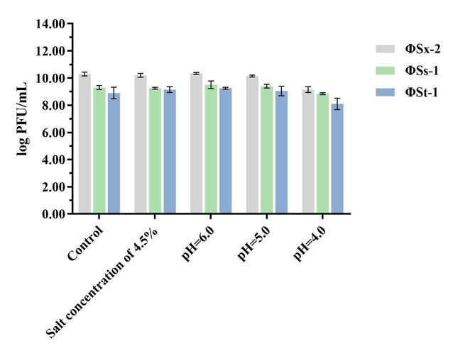 Figure 3. The survival of phages ΦSx-2, ΦSs-1, and ΦSs-2 under high salt concentration and low pH conditions. The values are the mean of three experiments, which showed no significant differences.