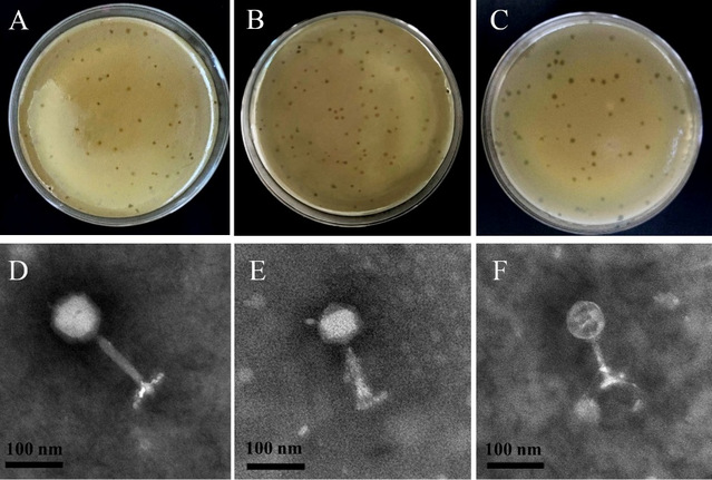 Figure 1. The plaque morphologies of phages ΦSx-2 (A), ΦSs-1 (B), and ΦSs-2 (C), as well as the transmission electron microscope images of phages ΦSx-2 (D), ΦSs-1 (E), and ΦSs-2 (F). Scale bar = 100 nm.