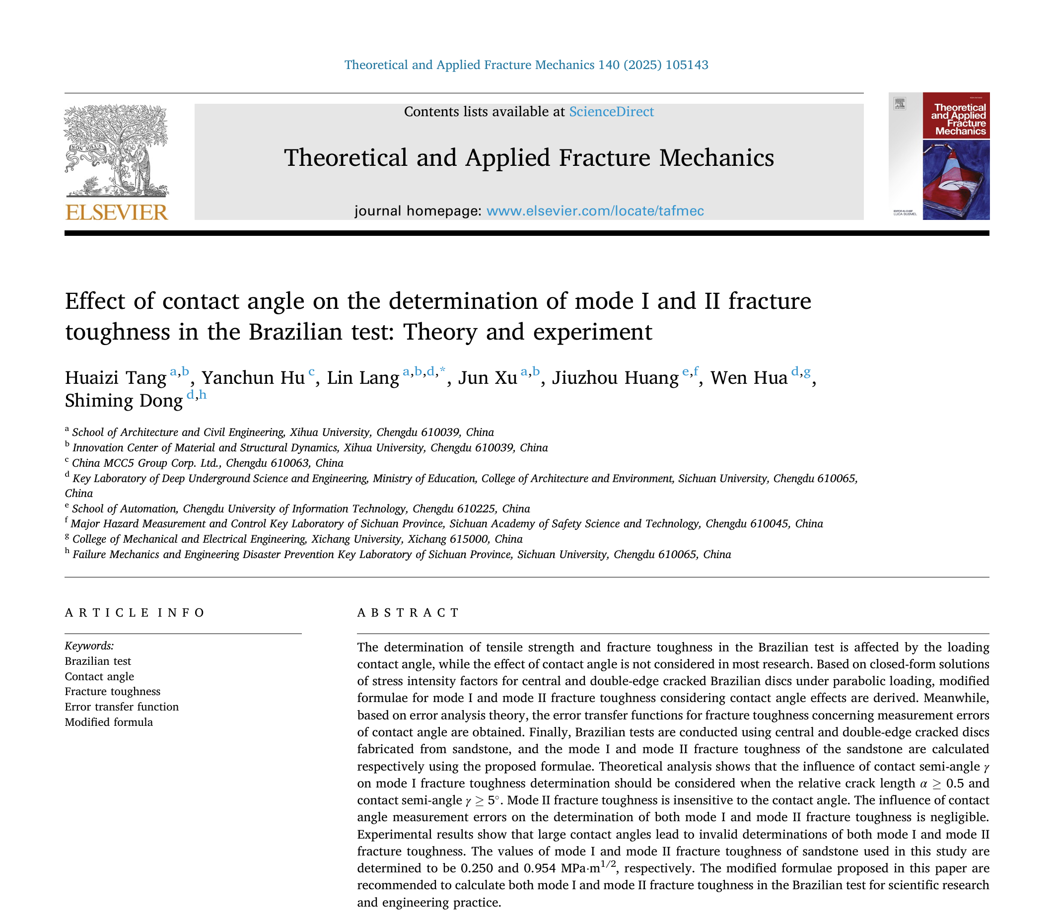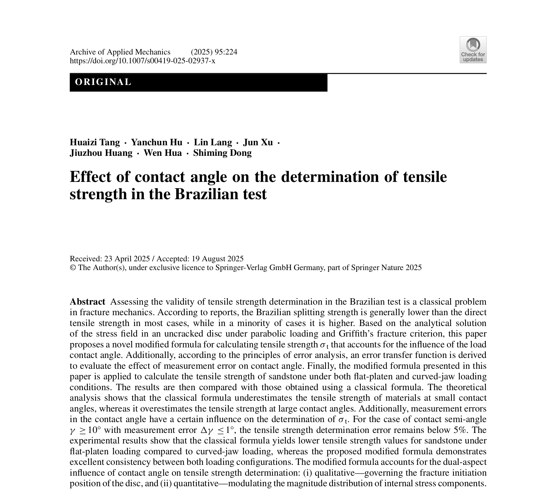 近日,建筑与土木工程学院材料与结构动力学创新研究团队在国际知名期刊《Theoretical and Applied Fracture Mechanics》(JCR一区、中科院二区TOP,IF=5.6)和《Archive of Applied Mechanics》(JCR二区、中科院三区,IF=2.5)分别发表题为“Effect of contact angle on the determination of mode I and II fracture toughness in the Brazilian test: Theory and experiment”和“Effect of contact angle on the determination of tensile strength in the Brazilian test”的系列研究成果。Beat365唯一官方网站为论文第一单位,建筑与土木工程学院郎林副教授为通讯作者,团队汤淮子博士为第一作者、徐军博士为参与作者。