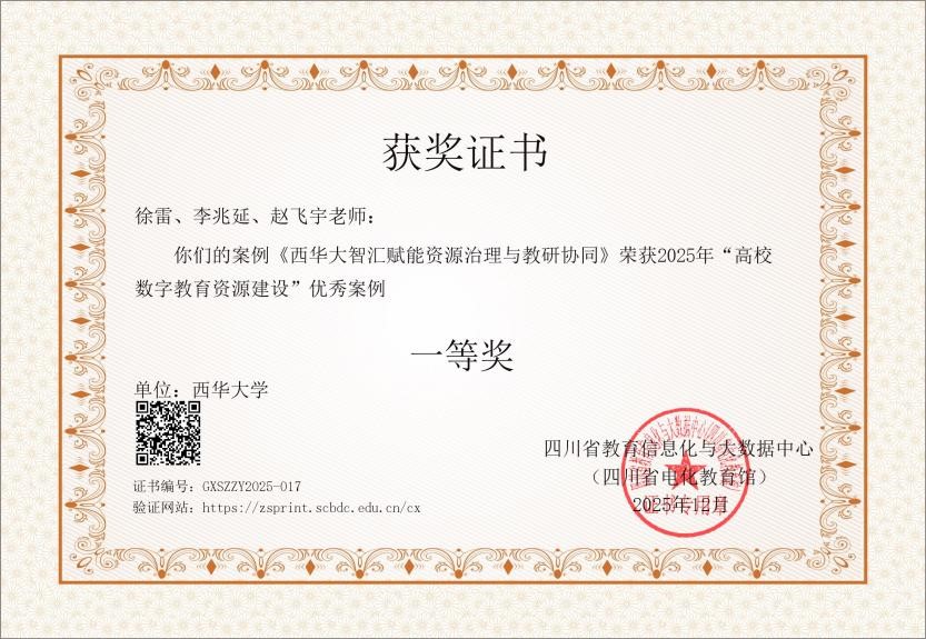 此次获奖是对学校数字教育资源建设工作的充分肯定。2025年,学校网信工作取得系列成果,网络安全工作获评省委网信办主办的“四川省网络安全优秀案例”,数据中台建设获四川省数据局主办的“优秀技术创新奖”。