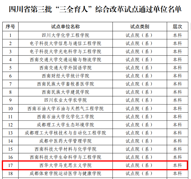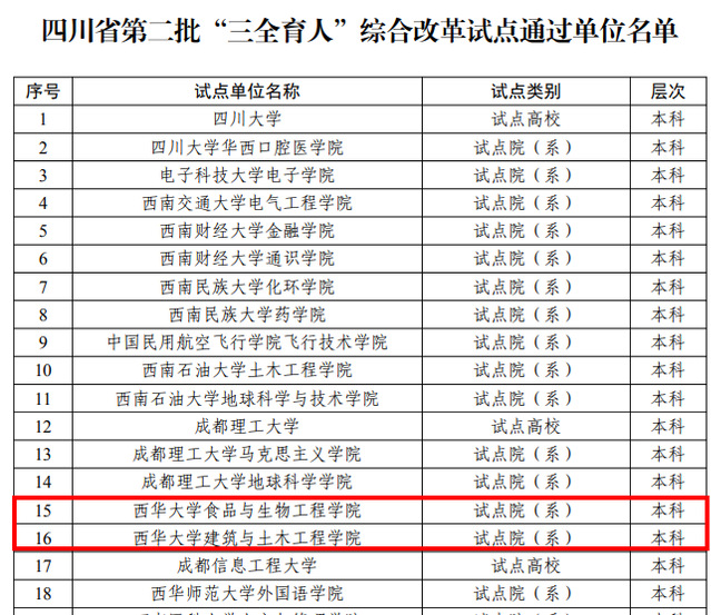 近日,中共四川省委教育工委办公室发布《中共四川省委教育工委办公室关于公布第二批、第三批“三全育人”综合改革试点总结评审结果的通知》(川教工委办函〔2025〕7号),Beat365食品与生物工程学院、建筑与土木工程学院、马克思主义学院顺利通过评审。其中,食品与生物工程学院提交的案例《强化班导师育人机制,释放综合改革新效能》获评“综合改革试点优秀典型案例”。
