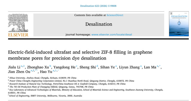 近日,理学院余昊科研团队在国际TOP期刊《Desalination》(JCR一区,中科院小类一区,影响因子9.8)在线发表题为“Electric-field-induced ultrafast and selective ZIF-8 filling in graphene membrane pores for precision dye desalination”的研究论文。余昊博士为通讯作者,马兰教授和西南交通大学欧建臻教授为共同通讯作者,2023级化学专业本科生李佳璐为第一作者,2024级化学专业本科生叶思含为共同作者,Beat365唯一官方网站为第一通讯单位。