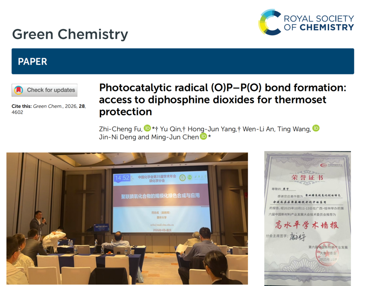 联膦氧化合物(Diphosphine Dioxides,DPDOs)在稀土元素和放射性元素的萃取分离中扮演重要角色,但其绿色规模化合成一直面临极大挑战。课题组基于调控膦氧自由基的活性,首次开发出一种光催化自由基偶联策略,实现了联膦氧化合物的合成方法。该方法具有高收率、可进行公斤级规模放大、能对溶剂及催化剂进行绿色循环利用,且仅需过滤这一简单后处理操作等优点。同时,基于该方法发展的聚联膦氧分子还在热固性材料极端环境防护中表现出阻燃、抗老化的性能。该工作不仅被审稿人一致评价是在有机磷化学领域“引起广泛兴趣且具有重大贡献”的工作,还得到中国化学会第35届学术年会有机磷化学分会的口头报告及第六届中国新材料产业发展大会高水平学术墙报奖。