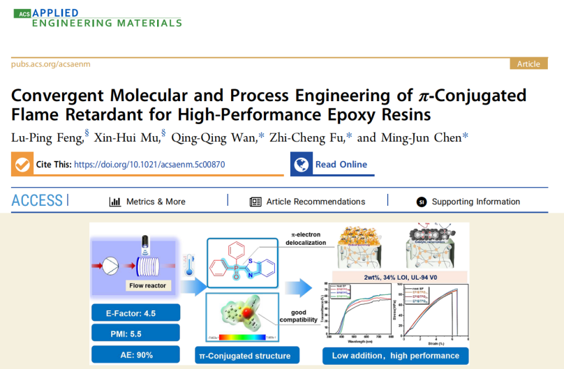 通过分子掺入来开发阻燃环氧树脂一直面临着一个根本性的权衡,即高添加剂负载量、机械和光学性能的保持以及合成过程的环境友好性之间的平衡。在此,我们通过一种分子和工艺工程相结合的策略,在温和条件下,利用可见光光催化连续流平台合成了具有定制π共轭结构的苯并噻唑磷氧化物(BTPO)阻燃剂。这种绿色方法实现了直接的C(sp2)-P偶联,具有出色的可持续性指标:90%的原子经济性、4.5的E因子和5.5的过程质量强度。分子设计使得在2%(重量)的超低负载量下具有出色的阻燃性能,使环氧树脂达到UL-94 V-0等级和34.0%的极限氧指数。这项工作为多功能添加剂的设计建立了一个可持续的范例,表明综合分子和工艺工程能够解决高性能聚合物复合材料长期以来存在的权衡问题,该项工作也在中国化学会第35届学术年会的墙报展示环节中进行了展示。