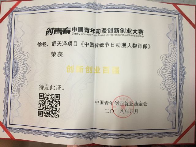 最后,两位同学的作品“中国传统节日动漫人物肖像”获得创新创业百强荣誉。