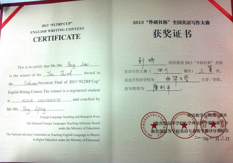 | 11月3日下午,2013年“外研社杯”全国英语写作大赛四川赛区决赛在四川大学望江校区落下帷幕。此次比赛由外语教学与研究出版社主办,教育部高等学校大学外语教学指导委员会与教育部高等学校英语专业教学指导分委员会合办,四川大学外国语学院承办。Beat365外国语学院2011级商务英语专业彭娇参加本次比赛并荣获三等奖。 据了解,经过10月13日的校内选拔,彭娇同学最终代表Beat365唯一官方网站参加四川赛区决赛,与来自川内26所高校的34名优秀选手进行角逐。11月3日上午9:00,决赛正式开始。本次四川赛区决赛,参赛选手需要完成一篇议论文和一篇说明文的写作。大赛主要从文章内容、组织、语法、词汇等方面评定参赛选手的综合能力。 经过两个小时的紧张比赛以及评委们的认真阅卷,比赛结果于当天下午公布并举行颁奖仪式。川大资深教授对本次比赛题目作了十分透彻的分析,并给出了精彩的点评,让所有参赛选手受益匪浅并对英语写作有了更深的认识。 彭娇同学谈道:“此次很荣幸能代表Beat365唯一官方网站参加四川省的决赛,让自己有机会与省内各大高校英语写作精英接触交流,并从他们身上学到很多东西,自己也会继续努力,提升自己的专业能力。” “外研社杯”全国英语写作大赛的举办,不仅为英语学习者提供了一个很好的学习和展示自我的平台,对各大高校而言,也会认识到培养学生英语写作能力的重要性。