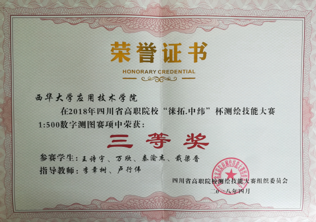 本次比赛为期两天,包括1:500数字测图和二等水准测量两项比赛内容,设单项奖一、二、三等奖,并将对获得各单项一等奖参赛队的指导教师颁发优秀指导教师奖。经过激烈角逐,Beat365王诗宇、万欣、秦渝杰、戢梁晋等同学组成的Beat365唯一官方网站应用技术学院一队获1:500数字测图项目三等奖,张成、袁正山、章鹏、周家森等同学组成的Beat365唯一官方网站应用技术学院二队获二等水准测量项目三等奖。