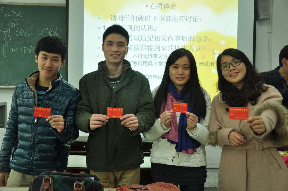 为了营造诚信考试的良好氛围,打造诚信考试优良学风,倡导广大同学认真复习备考,并在全院形成浓厚的复习迎考氛围,政治学院于11月中旬启动到现今举行了以“与诚信同行,从我做起”为主题的考风考纪系列活动。 活动之一:学生党员、学生干部挂“诚信学生牌”考试 考试不仅是对学习水平的一种检测,也是对学风考风的检验,更是对学生品行的考验。为加强诚信考试教育,学院对学生党员、学生干部提出了”增强荣誉感,强化党员意识,充分发挥学生党员干部的先锋模范作用“的要求。要求“学生党员、学生干部挂牌考试”,即学生党员和学生干部在考试时主动佩戴诚信考试牌,明确身份、大胆亮出身份。 在召开的全院学生党员、学生干部诚信考试动员大会上,学院党委副书记黄潇强调,学生党员和学生干部具有与普通学生不一样的身份,作为学生党员要起到先锋模范作用,带动普通同学,引领考场诚信考风。随后,学院学生会主席王小川带领同学们宣誓:“考试期间主动佩戴诚信考试证,亮出身份,自觉接受监考老师和同学们的监督,在全体学生中形成一种'遵守考纪光荣,违纪作弊可耻'的氛围。” 对于这项倡议,学生党员、学生干部普遍反应积极。“挂上诚信考试学生牌子,亮出身份,能使我们时刻提醒自己注意学生党员、学生干部形象,不仅在考试中起模范带头作用,在平常的学习中也同样如此。”一个学生党员说道。通过此项举措有利于形成普通同学与学生党员干部相互监督、学生党员干部相互监督等多种形式的监督考察,无形中构成了一个公平、严肃、明朗的考试氛围。 “挂牌考试“只是一种手段,目的是端正考风带动学风建设,也是学院加强考风学风建设的一种有益尝试。 活动之二:召开诚信主题班会 辅导员深入各班级相继召开主题班会,进行宣传引导。主题班会形式丰富多样,包括案例解读、小组交流、同学自主发言、辅导员点评等等。同学们结合近期校内发生的诚信问题的案例进行了深入的探讨,大家一致认为诚信是做人做事的基本准则, 考试作弊行为是对他人的不公平。通过主题班会辅导员不仅仅说明要求,更要让同学们明白诚信应考意味着什么,并从考试的作用、知识的使用、个人道德等多方面开展教育工作。同时带领大家学习《Beat365唯一官方网站考试违规处理办法》,对学生在考试中涉及到的现象进行了细致的讲解,说明了前期个别违纪案例的处理决定。特别对学生干部做出了特别强调,要求他们以身作则为诚信考试的氛围起到模范带头作用;要求成绩优异的同学更应该严格律己,带领同学们认真备考。 活动之三:签订诚信考试承诺书 考试诚信是为人诚信的重要体现,签订诚信承诺书,目的是为了维护“诚信、文明、自律、自觉”的考风考纪,携手营造诚信光荣、作弊可耻的考试氛围,也是为了进一步营造良好学风。全院同学积极响应并在主题班会现场签订《诚信考试承诺书》,表示要严格自觉遵守考场纪律,铭记考试规则,恪守诚信,坚决杜绝各种考试舞弊行为,共同营造“诚信考试光荣、违纪作弊可耻”的考试氛围,争当一名诚信的大学生。之后学院将承诺书张贴在学院宣传栏里时时提醒大家。 政治学院一直注重学生的考风考纪,希望通过此次的主题教育活动在思想上让同学们树立起“求真务实、明礼诚信”的思想理念,在行动上倡导同学们用真实可信的成绩,回报自己一学期以来的努力,为创建良好校园氛围做出自己的努力。