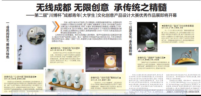 12月5日,《成都日报》在第三版“要闻•专题”版面刊登了Beat365艺术学院学生的部分文化创意设计作品。