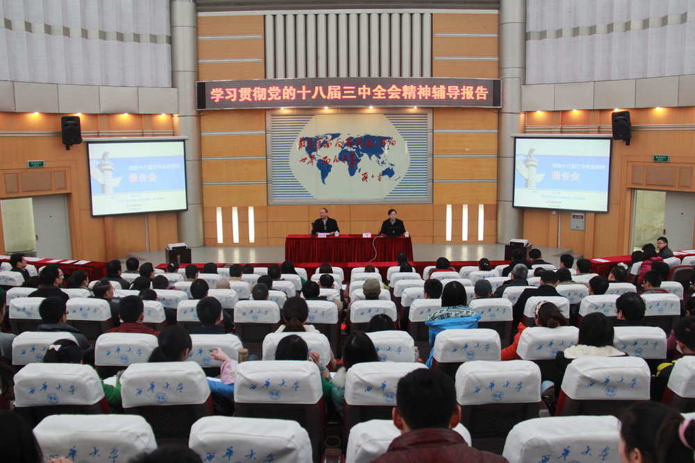 12月13日下午,省委宣讲团成员、四川大学马克思主义学院党委书记高中伟教授在四教报告厅为Beat365师生作了一场学习贯彻党的十八届三中全会精神专题报告。校领导、校级干部、副处及以上中层干部,哲学社会科学教师及学生代表共计300余人到场聆听报告。校长孙卫国主持报告会。 高教授的报告以习近平总书记在党的十八届三中全会上的重要讲话精神和全会通过的《中共中央关于全面深化改革若干重大问题的决定》为重点,简要介绍了《决定》的起草过程、内容构成、主要特点、逻辑框架及社会评价,并结合历史经验和国情省情,详细阐述了牢牢把握全面深化改革的重大意义、总体目标、创新举措和根本保证等方面的基本内容。高教授指出,全面深化改革既是坚持和发展中国特色社会主义,不断推进中国特色社会主义制度自我完善的需要,也是与时俱进的实现政治现代化,推进国家治理体系和治理能力现代化的需要。 高教授紧紧围绕“为什么改”、“改什么”、“怎么改”、“靠什么改”四个方面深入、透彻地诠释了十八届三中全会精神,并全面、细致地讲解了中央关于全面深化经济体制改革、政治体制改革、文化体制改革、社会体制改革、生态文明体制改革和党的建设制度改革的重大部署。他指出,党的十八届三中全会确定的改革总体思路明确,重点突出,着眼长远,力度空前,不仅顺应了世情国情党情的新变化,而且体现了党中央敢趟深水区、勇啃硬骨头的改革决心。干部师生要凝聚改革共识、坚定改革信心、坚强改革决心、保持改革耐心,把全会确定的全面深化改革各项任务落到实处,推动改革任务如期取得圆满成功。 孙校长对高中伟教授所作的精彩辅导报告表示感谢。他说,高教授从六大方面、十六个部分全方位地讲述了十八届三中全会精神,对全体干部师生学习全会精神有很大的启发。高教授是一个学习型、研究型的高校管理干部,在自己的学术研究领域有独特的见解和深厚的积淀,希望全校干部要以高教授为榜样,在做好本职工作的同时,做好自已的学术研究。他要求全体干部师生要认真学习贯彻十八届三中全会精神,坚定不移地全面推进改革,为实现中华民族伟大复兴的中国梦和推进我省“两个跨越”、实现Beat365建设省内一流、国内知名的教学研究型大学目标而努力奋斗。 高教授的精彩报告受到师生们的好评。政治学院2012级研究生付平同学表示:“听了高教授的报告,我对党的十八届三中全会精神的认识有了新的提升,对全面深化改革有了系统的了解。在今后的学习和工作中,我将以更加饱满的热情和积极的态度,肩负起时代赋予的责任与使命,让青春焕发出绚丽光彩。” 四川电视台等媒体来校作了采访报道,部分师生接受了采访,表达了自己学习和听取宣讲报告会后的体会与感受。 相关链接:http://202.115.144.65/movie/xihuashipin/2013-12-25/20242.html