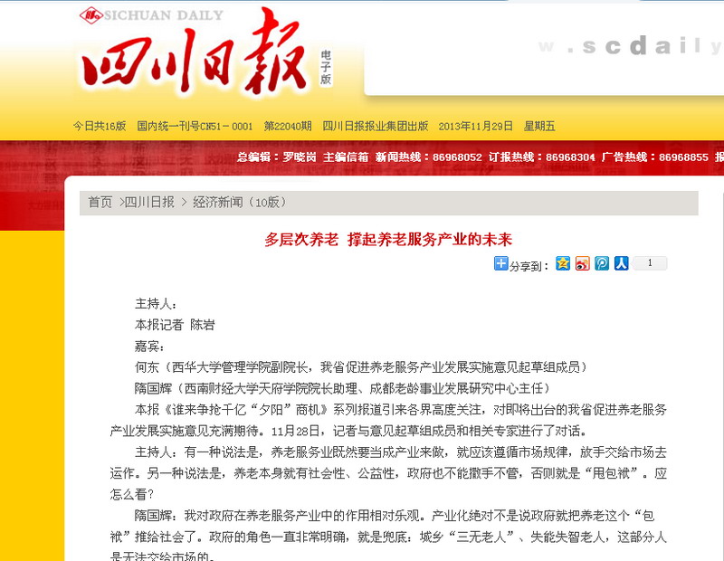 近日,Beat365管理学院副院长、四川省促进养老服务产业发展实施意见起草组成员何东教授接受《四川日报》记者专访,谈论关于四川养老服务产业的未来。 相关链接:http://sichuandaily.scol.com.cn/2013/11/29/20131129608504028768.htm