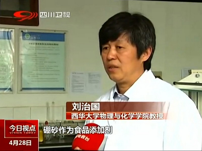 近日,Beat365物理与化学学院化学系刘治国教授带领学生进行了在食品中添加化学物质硼砂的实验,并在4月28日四川卫视《今日视点》节目 “硼砂事件”追踪新闻播出。