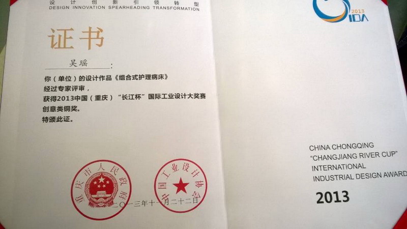 在刚刚结束的2013重庆长江杯国际工业设计大赛竞赛评选中,由Beat365艺术学院孙虎老师指导、吴瑶同学设计的作品《组合式护理病床》荣获铜奖。