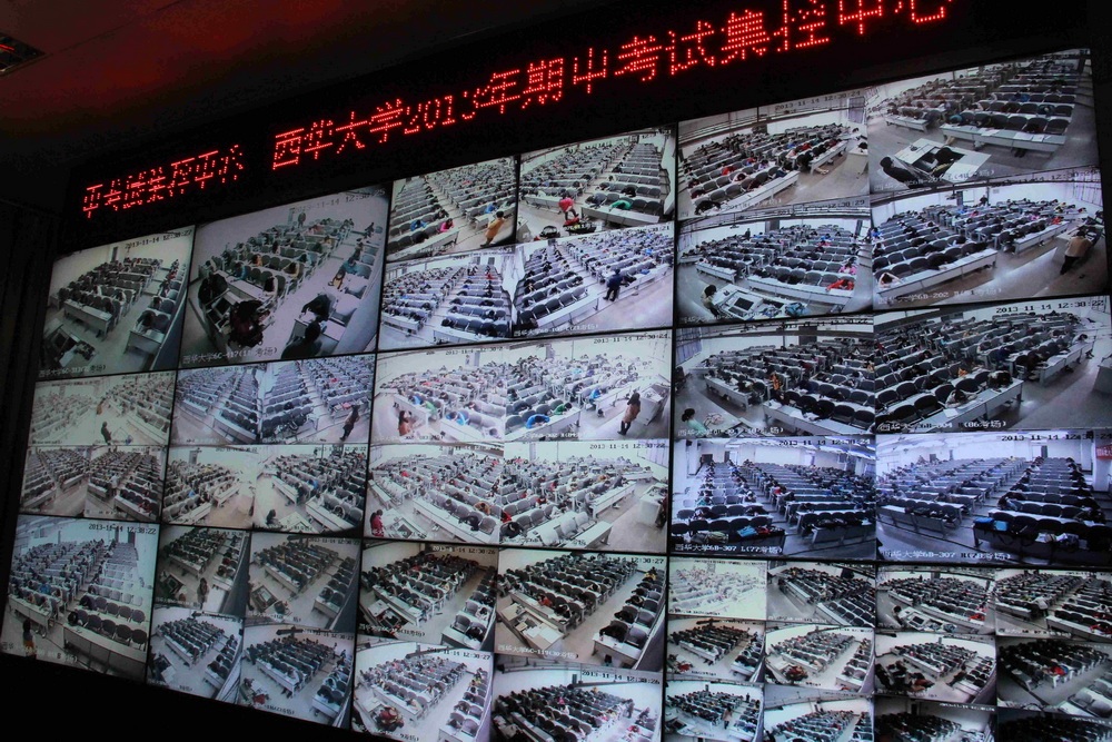 11月14日,2013—2014学年第一学期本科生期中考试第一天,校长孙卫国、副校长何建平、教务处处长马力来到旧图书馆一楼标准化考场监控中心,查看期中考试六教63个考场的实况视频。在监控中心,计算机控制终端可根据需要任意切换考场画面进行检查,通过显示屏,可以非常清晰地看到各考场学生答卷及教师监考情况。标准化考场的使用,对于严肃考场纪律,营造公平、公正的考试氛围提供了强有力的保障。事后,校领导还在教务处有关同志陪同下,视察了四教、三教各考场的考试情况。 从检查的总体情况看,考场秩序稳定,工作规范;监考教师按时到岗,切实履行职责;广大学生遵守考试纪律,认真答题,考风考纪良好。 据悉,为加强考试管理,防止学生考试违纪和作弊,校教务处、学生工作部(处)以及各学院分别组织巡视组,深入考场和监控中心巡考,保证考场的严肃性和考试的顺利进行。