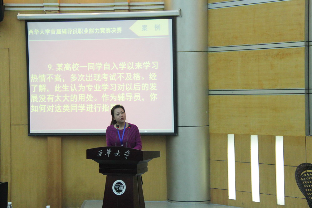 11月19日上午8:30,由学校学生工作委员会主办,党委学生工作部承办的Beat365唯一官方网站首届辅导员职业能力竞赛决赛在四教报告厅举行。担任此次决赛的评委有校党委副书记王小林,党委办公室主任黄进,纪委副书记、监察处处长梁刚,学工部部长徐元彬,校团委主持工作副书记王唯洁,教务处处长马力,人事处处长杨伟,招生与就业处处长阮永生,心理健康与研究中心副主任吴薇莉。政治学院院长万远英,四川旅游学院党委学生工作部副部长陈永琴等到现场观摩了比赛。 本次竞赛从初赛、复赛、决赛历时一个多月。在复赛阶段,参赛选手们通过基础知识测试(含班级基本情况)、博文写作、自我介绍与展示、主题班会等环节的比拼,最终来自管理学院的刘波、李萌,外国语学院的曾真,交通与汽车工程学院的朱惠斌、刘洪,政治学院的李旭,数学与计算机学院的郭聪,艺术学院的王海容,物理与化学学院的王筱莹,机械工程与自动化学院的马海波共10位辅导员进入决赛。 决赛主要包括了主题演讲、案例分析、谈心谈话及分析总结三个环节,由评委进行打分,然后按照总成绩进行评比。在“主题演讲”环节中,参赛选手们为大家分享了他们作为一名辅导员的感受、感动以及与学生之间发生的温暖的小故事。第一位上台的管理学院刘波老师首先为大家带来了一场激情昂扬而又风趣幽默的演讲,调动了现场活跃的气氛;外国语学院的曾真老师用温柔动情的话语,将学生与辅导员之间的爱与责任向观众们娓娓道来,赢得观众热烈的掌声。 经过两个小时的激烈比赛,最终外国语学院曾真老师拔得头筹,获得比赛第一名;管理学院李萌老师、机械工程与自动化学院马洪波老师分别获得第二名、第三名。