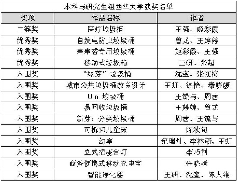 由中国高等教育学会设计教育专业委员会、教育部高等学校设计学类专业教学指导委员会、化学工业出版社主办,河南嵩县人民政府、香港欧能德国际集团协办的“2013第二届中国高等院校设计艺术大赛”于近日公布了比赛结果。Beat365艺术学院工业设计系在本次竞赛中取得了丰硕的成果,在本科与研究生组中获得了二等奖1项、优秀奖3项、入围奖10项。本次设计竞赛作品均由艺术学院周睿老师设计指导和组织参赛。 据悉,本届大赛收到了参赛作品约3000件,参赛院校达278所。竞赛奖项按作品数量比例设置为特等奖(1‰)、一等奖(1%)、二等奖(3%)、三等奖(5%)、优秀奖(10%)、入围奖若干。组委会于10月7日至10月10日进行了大赛的初评和终评,来自中央美术学院、清华大学美术学院、中国传媒大学、北京电影学院等高校的九位业内专家学者参与了评审。 在本次大赛中,艺术学院周睿老师将自身负责的教育厅基地四川循环经济研究中心项目“节能减排消费与绿色设计的应对研究”(编号XHJJ-1306)与课堂教学相结合,在课程《设计研究》中设置的设计任务与研究任务相契合,以垃圾桶为设计对象,让同学们带着研究方法去调研、带着目的去设计,经过充分开展头脑风暴、课程调研与设计讨论,最终形成作品,并在课堂的设计调研环节还绘制出了“成都市垃圾桶类型粗略分布图”。然后将比较优秀的设计作品经过有序的参赛组织,从而取得了比较突出的成绩。 参加本次比赛,一方面是教学改革中“教—研—学”结合的有益尝试;另一方面也是同学们进行“课上专业学习—课下专业竞赛”的探索,参赛既丰富教学成果又拓展了设计技能。 链接:http://www.sjds.cip.com.cn/News_view.asp?id=35 附:获奖名单 |