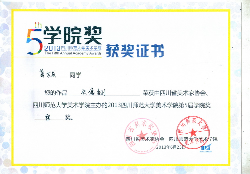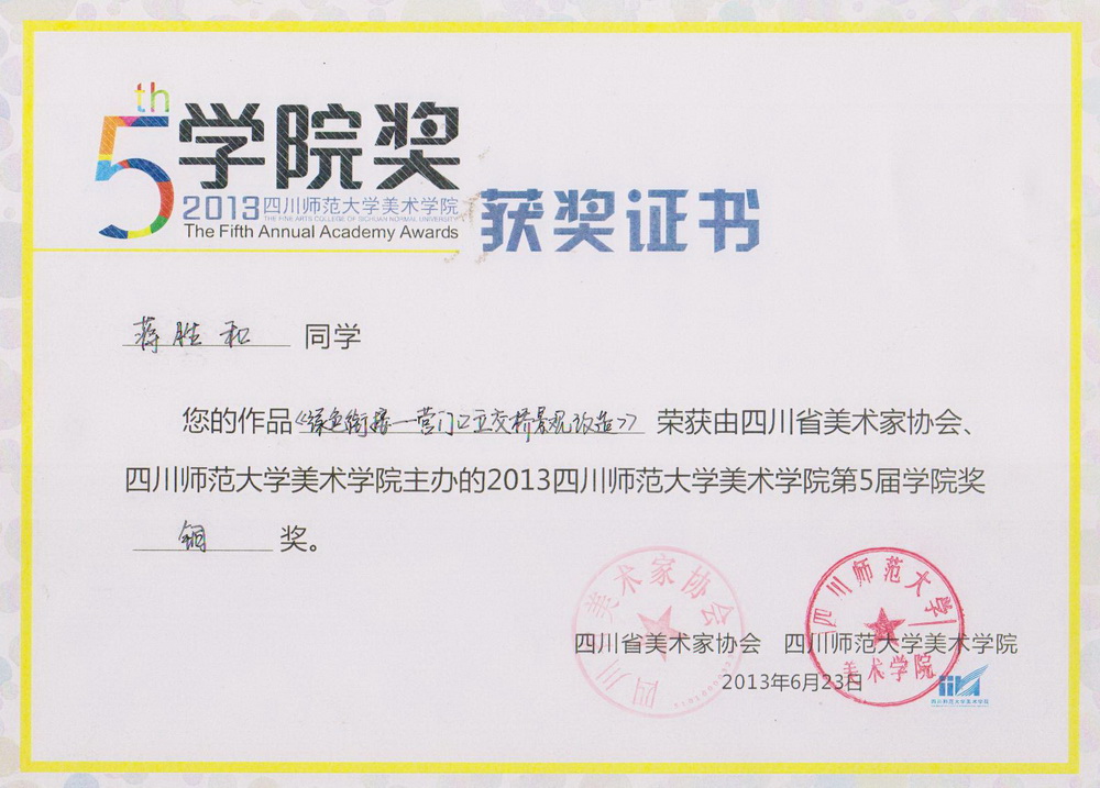 6月23日,由四川省美术家协会和四川师范大学美术学院主办的“第五届学院奖”颁奖典礼在成都美术馆隆重举行。来自Beat365唯一官方网站、四川大学、四川师范大学等10所高校400余件作品参加了此次比赛。Beat365共选送10件学生作品参加比赛,由冯戈老师指导的葛龙成同学的作品《头像系列》获银奖,冯振平老师指导的蒋胜河同学的作品《绿色衔接——营门口立交桥景观改造》获铜奖,汤雪蕊等7人8件作品获入选奖。