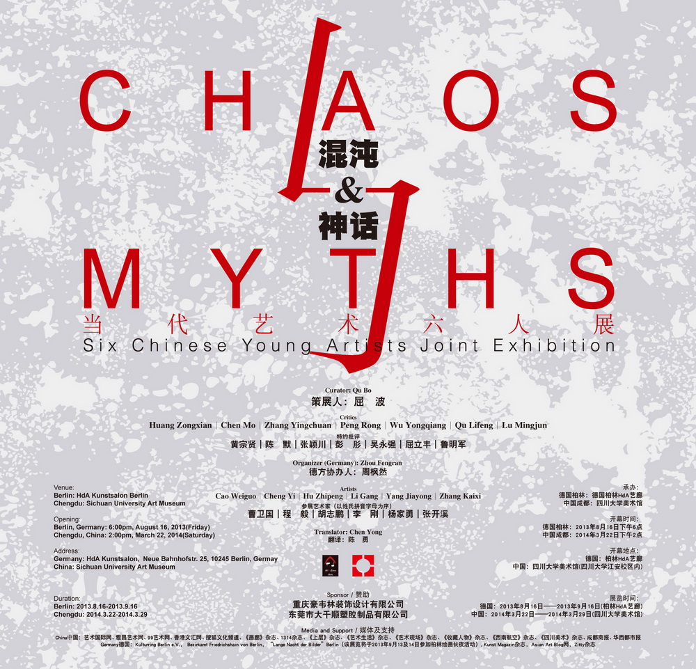9月14至15日,由Beat365艺术学院教师屈波博士策划的展览“混沌与神话:当代艺术六人展”(Chaos and Myths: Six Chinese Young Artists Joint Exhibition)参加柏林艺术长夜(Lange Nacht der Bilder)活动。 “柏林艺术长夜”是由柏林文化部、柏林各区政府及画廊、博物馆合作的文化活动。本次活动为第六届柏林艺术长夜,由柏林市长Klaus Wowereit领衔,主题为“生存的世界Lebenswelt”,主要是展现人类生存世界的多元文化和艺术。参加本次活动的观众多达4万人。据策展人屈波介绍,参加本次展览的六位艺术家曹卫国、程毅、胡志鹏、李刚、杨家勇、张开溪,是当代的年轻艺术家,其艺术呈现出相当程度上的共性,集体转向了通过神话或类神话去表征当下社会的某种现实,以远离这个社会表象的方式去深度表达社会的精神症候。艺术家们在那些远离和迥异于日常生活的形象中,寄托着他们的思考。因此可以说,神话或类神话其实不是神仙的故事,而是关于他们自身的故事。而这些故事,有时也与作为观者的我们相关。在展览现场,参展艺术家代表杨家勇、胡志鹏举办了讲座,分析参展艺术作品,与柏林本土艺术机构、艺术工作者及市民交流,介绍中国本土青年艺术家的生存状态。内蒙古青年歌手呼麦在现场作了表演。 此次展览在柏林HdA艺廊举行。荷兰阿姆斯特丹皇家博物馆亚洲馆策展人王静灵、柏林中国文化中心主任陈建阳、德国国家博物总馆亚洲部研究员、艺术史博士尹萌,柏林孔子学院负责人、柏林自由大学汉学系负责人MECHTHILD LEUTNER(罗梅君),中德商务联盟驻柏林代表、柏林中国学生联合会联络人王子恒,中国国际民间组织合作促进会德方负责人Patrick schröder,柏林文化部柏林艺术长夜负责人Angelinka David,柏林刑事警察联盟副主席Marco Schmidt、柏林自由大学东亚艺术史系教授Jeong-hee Lee-Kalisch(李静姬),东方艺术史家、汉学家但亦文,China Conception策展人罗玲,德国亚琛大学中国部负责人、汉学博士Birte Seffert以及本次展览的参展艺术家代表杨家勇、胡志鹏等出席并观看展览。现场活动由艺术史博士周枫然主持。 本次展览得到了中国文化中心、柏林孔子学院、德国柏林市政府、Das neue China 杂志、Deutsch-Chinesischen Allgemeinen Zeitung(德中汇报)、Kulturring Berlin e.V.、 Bezirkamt Friedrichshain - Kreuzberg von Berlin、 Kunst Magazin杂志、Asian Art Blog网、Zitty杂志、Bundesministerium für Arbeit und Sozials、柏林网http://www.berlin.de/、HOWOGE公司、Liegenschaftfonds Berlin基金会的大力支持。 |