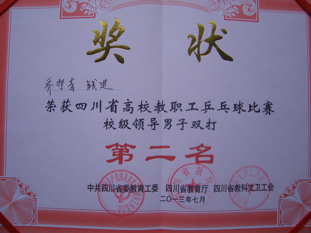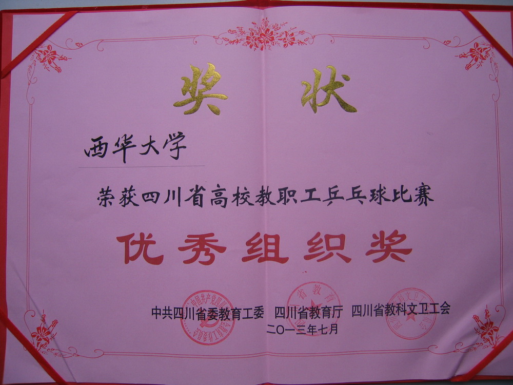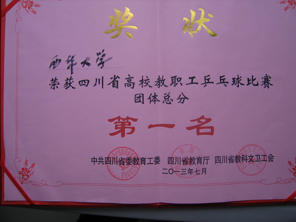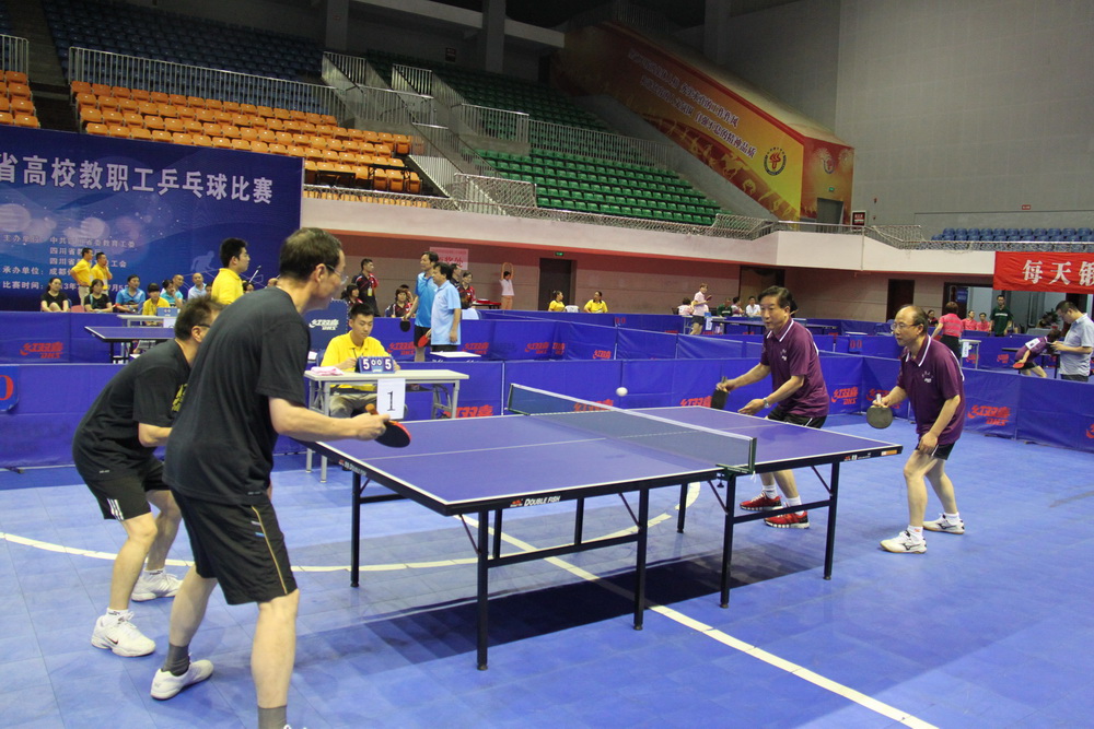 7月3日至5日,由省委教育工委、省教育厅、省教科文卫工会联合主办的2013年四川省高校教职工乒乓球比赛在成都体育学院举行。Beat365教职工乒乓球代表队一行在领队、校工会常务副主席王代言,乒乓球世界冠军、陈龙灿教练的带领下,与来自全省31所高校的近三百名教职工参加了本次比赛。经过激烈角逐,Beat365副校长乔哲青与正厅级调研员钱进获得校级领导组男子双打第二、教职工组获得团体总分第一的好成绩,学校获优秀组织奖。 本次比赛共设团体赛(男子单打、女子单打、混合双打)及男子单打、女子单打,校级领导男子双打、女子双打四个单项。团体赛分两阶段举行,第一阶段采用分组循环赛,第二阶段各小组第1名重新抽签并采用淘汰赛决出前8名。教职工组男子单打、女子单打比赛采用淘汰赛,采用三局两胜,11分制。 比赛前举行了开幕式。开幕式由四川省教科文卫工会主席黄亚利主持。省委教育工委副书记、省教育厅党组成员王晓都,省总工会党组成员、副主席武晓鹏出席开幕式。王晓都在开幕式上作了讲话,并希望各参赛运动员、裁判员、工作人员遵循重在参与的原则,坚持友谊第一、健康第一,做到“组织好、比赛好、成绩好”,共同把本次比赛办得圆满成功,展现我省高校教职工的精神风貌。 据悉,赛前校工会为组织教职工参加本次比赛作了大量的准备工作,如选拔队员、配合训练、组织协调。
