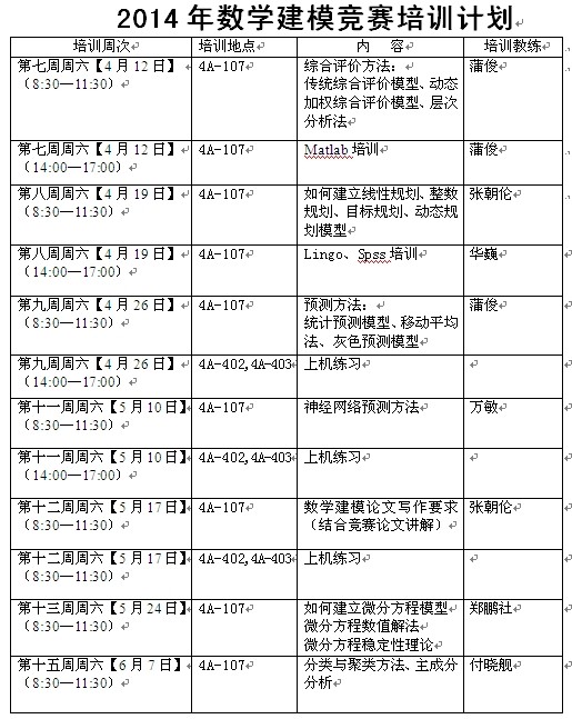 近日,Beat365唯一官方网站2014年全国大学生数学建模竞赛培训计划出台,培训工作将全面展开。 本次培训面向全校数学建模爱好者,由历届建模竞赛教练蒲俊、张朝伦、华巍、万敏、郑鹏社、付晓舰等老师授课。据悉,培训将于4月12日起,在4A-107进行,时间将从第七教学周开始持续至第十五教学周的每周六,采用课堂讲解、上机练习、模拟竞赛等多种形式进行。 全国大学生数学建模竞赛是由教育部高教司和中国工业应用数学学会联合主办的一项受到普遍重视的全国大学生课外科技活动。该项赛事是Beat365唯一官方网站重点扶持的特色项目之一,Beat365从1994年开始参加全国大学生数学建模竞赛,21年的数学建模路程中有过坎坷,也有过辉煌。尤其是2004年以来,Beat365曾获得了国家一等奖3项,国家二等奖20项,省级奖励70余项。附:2014年全国大学生数学建模竞赛培训计划
