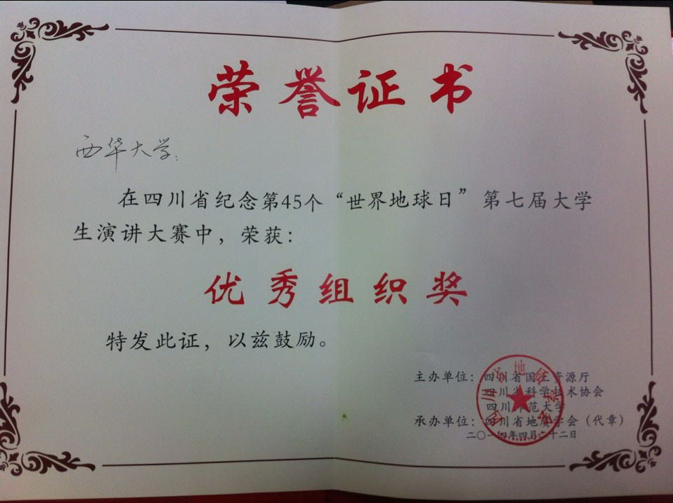4月22日,由四川省国土资源厅、四川省科学技术协会、四川师范大学联合主办的“四川省纪念第45个世界地球日”第七届大学生演讲比赛决赛在四川科技馆举行,Beat365人文学院黄娇同学代表学校参赛,在来自省内十余所高校中的13名选手中脱颖而出,荣获三等奖,Beat365唯一官方网站荣获“优秀组织奖”。