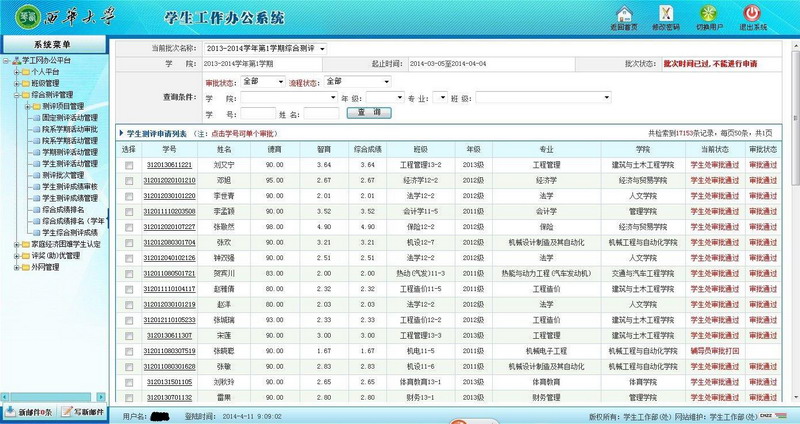 为表彰先进学生,树立典型,近日,Beat3652013-2014学年第一学期先进个人奖的评选活动如火如荼地拉开了帷幕。 本次学生先进个人奖评定较以往有较多的创新,其中,利用“Beat365唯一官方网站易班”开展网上申报与评定工作,促使学工系统和易班深度融合,成为本次学生先进个人奖评定的最大亮点。 本次学生先进个人奖评定分为“综合测评”、“先进个人奖申请及评定”两个阶段,均依托易班网络平台展开。学生登录易班,点击“学生工作业务平台”方可进行先进个人奖的申请。此外,学生工作部(处)为配合本次先进个人奖的网上评定工作,制定了“校内奖学金学工系统操作指南”,囊括了“学生、班长、辅导员、学院管理员的四级操作流程”。在申请全过程中,辅导员(班主任)借助易班平台可了解到所带班级、学生的情况,同时学生本人可以从网上直接看到自己的成绩、学分绩点,申请了的同学还能查询到自己所在班的排名情况以及其他申请同学的相关情况。 利用易班开展评定学生先进个人奖工作,不仅优化了学生工作流程,提高了办事效率,而且能更好地服务学生。目前,从各方面的信息反馈得知,广大学生对网上评定校内学生先进个人奖的反映较好。同学们普遍认为他们的知情权、参与权得到了充分的尊重,同时校内学生先进个人奖的评定会更加公开、公平、公正,有利于进一步加强学风、校风建设。 据悉,本次学生先进个人奖评定的“综合测评”阶段已经顺利结束,共有17153名学生通过测评,“先进个人奖申请及评定”工作正有序进行。 奖学金评定后台管理程序截图 |