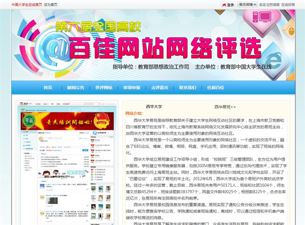 近日,由教育部主办、教育部中国大学生在线承办的第六届“全国高校百佳网站”名单揭晓。Beat365唯一官方网站易班网站榜上有名,获得“全国高校百佳网站”称号,并入围全国13个单项最佳奖之一的“最佳网络社区奖”。这是继2013年Beat365唯一官方网站新闻网入选“全国高校百佳网站”之后,Beat365易班网站再次获此殊荣。