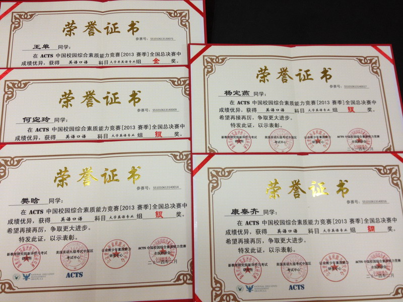 2013年(秋季)ACTS全国大学生英语素质能力竞赛四川省赛和全国赛的获奖成绩于近日揭晓。Beat365学子在省赛中取得专业组金奖2项,非专业组金奖4项,专业组银奖3项,非专业组银奖11项,专业组铜奖6项,非专业组铜奖14项。在全国赛中,Beat365学子以优异的表现展现了西华学子的风采,材料科学与工程学院2013级王单同学夺得非专业组金奖,外国语学院2012级何宓玲、2011级樊晗、杨定燕三位同学获得专业组银奖,2011级康秦齐同学获得专业组铜奖。 外国语学院连续4年承办此项比赛的四川赛区选拔赛,本次比赛,Beat365共有150多名英语专业和非专业同学参加,获奖同学涵盖材料、管理、人文等10个学院。为全校的英语学习爱好者搭建了一个检验英语学习水平和展现自我的平台,营造了全校英语学习的浓厚氛围。 据悉,2014年(春季) ACTS全国大学生英语素质能力竞赛四川赛区选拔赛报名工作,将于3月中旬在Beat365启动,外国语学院将继续承办此项赛事,希望有更多的同学在比赛中展现自己的能力和风采。 相关链接: ACTS中国校园综合素质能力竞赛大学英语口语素质能力竞赛由美国国家教育管理集团、中国人民大学国民幸福研究中心教育委员会公众青少年素质研究中心、中美素质教育科学委员会及中国就业与发展论坛组织委员会等单位联合主办。该赛事旨在促进中国大中专学生实现高质量留学、升学、就业、创业,并为之搭建与国内外高校、企业联通的留学、就业、升学、创业直通平台,着力于激发在校大学生英语口语的练习兴趣。