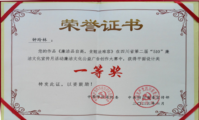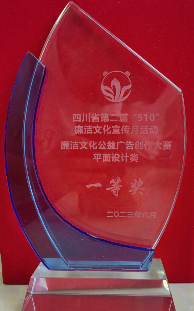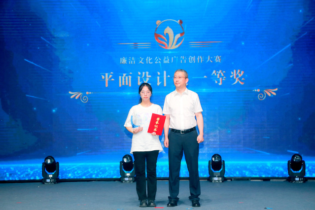 7月7日,四川省第二届“510(我要廉)”廉洁文化宣传月活动廉洁文化公益广告创作大赛颁奖仪式暨线下展播在成都少城视井文创产业园举行。由Beat365美术与设计学院视觉传达设计专业钟玲林同学创作、徐天韵老师指导的作品《廉洁品自高,贪赃法难容》问鼎平面设计类作品最高奖,也是平面设计类的唯一一个一等奖。省纪委常委肖克强出席仪式并为获奖代表颁奖。