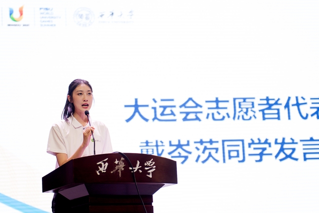 志愿者代表、法学与社会学学院学生戴岑茨在发言中讲到,作为一名青年志愿者,将秉持“奉献、友爱、互助、进步”的志愿精神,展现新时代中国大学生敢于担当、勇于奋斗、乐于奉献的精神风貌,用自信昂扬的姿态讲好中国故事,让青春在国际重大赛事服务中绽放青春之花。